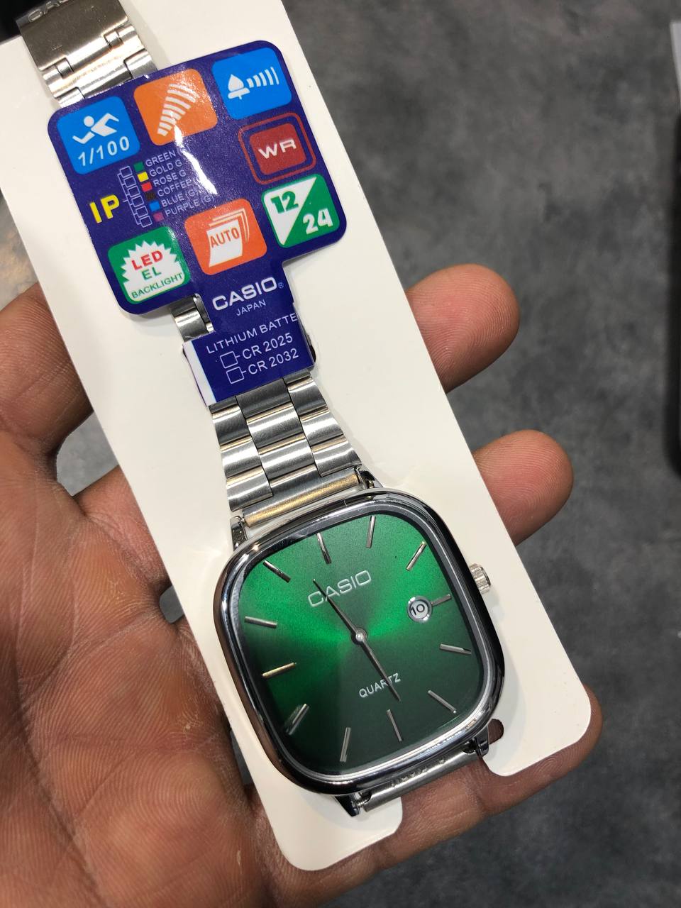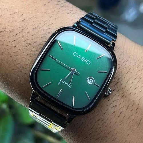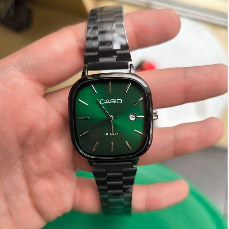 کاسیو الدمانی طرح مربعی موتور تاریخ دار ساعت دارای تقویم میباشد رنگ:بند مشکی رنگ ثابت و خود ساعت سبز جنس بند:استیل رنگ بندی بیشتر در سایت موجود است